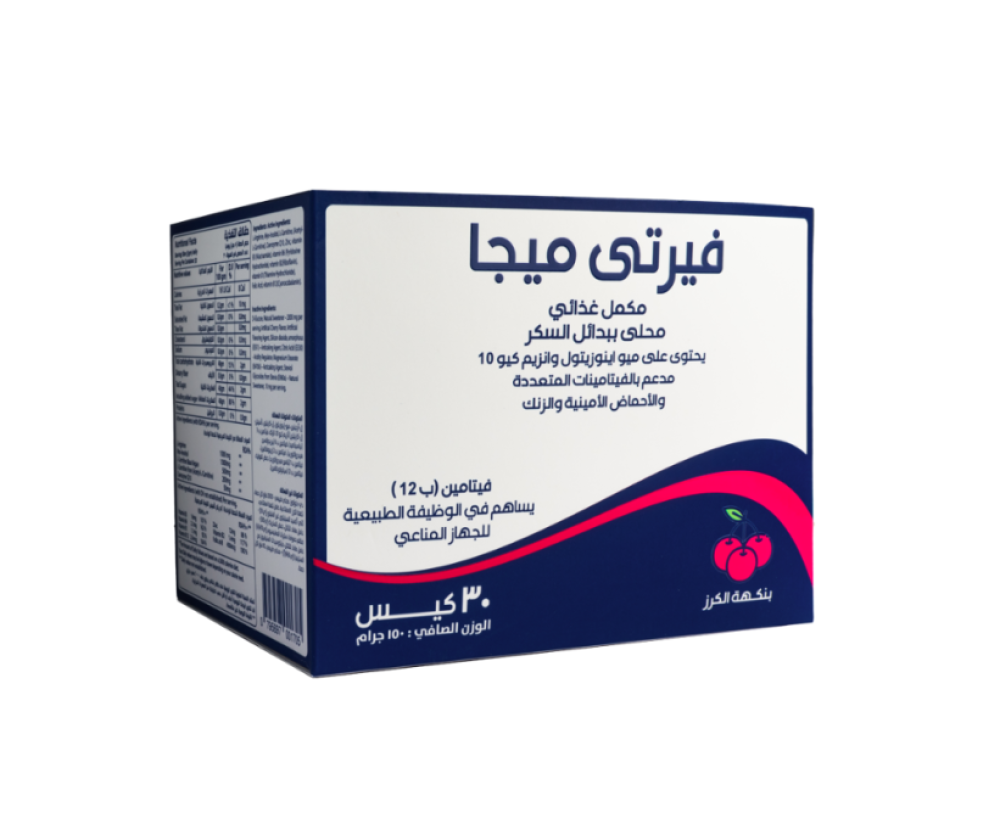 "فيرتي ميجا" هو مكمل غذائي مصمم للبالغين، يأتي في عبوة تحتوي على 30 كيساً بنكهة الكرز اللذيذة.
